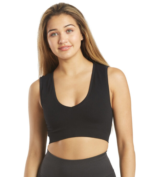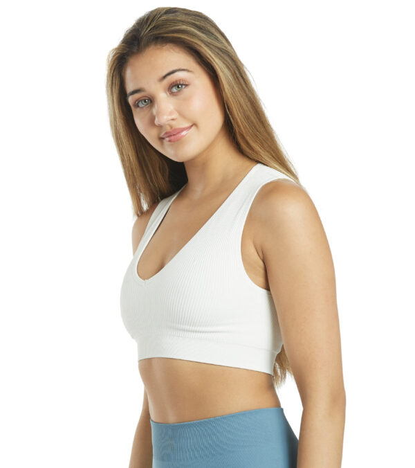 The Spiritual Gangster Ribbed Metta Plunge Yoga Brami offers the right amount of support during a low impact practice.